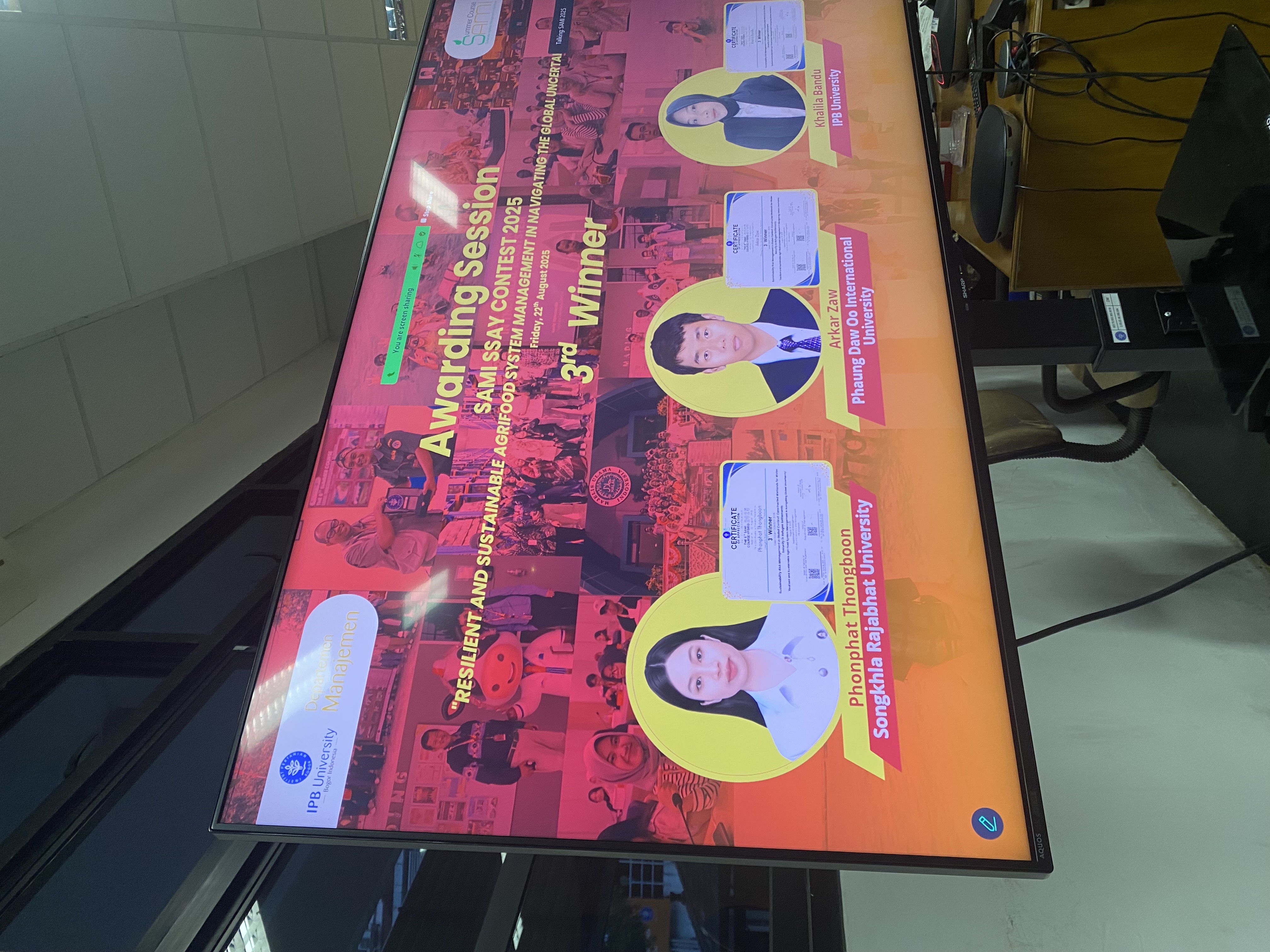 ได้รับรางวัลชนะเลิศอันดับที่ 3 จากการประกวดเรียงความ สืบเนื่องจากการเข้าร่วมโครงการอบรม Sustainable Agrifood Management in donesia (SAMI) : Resilient and Sustainable Agrifood System Management in Navigating the Global Uncertainty ระหว่างวันที่ 11 – 18 สิงหาคม 2568 อบรมผ่านระบบออนไลน์